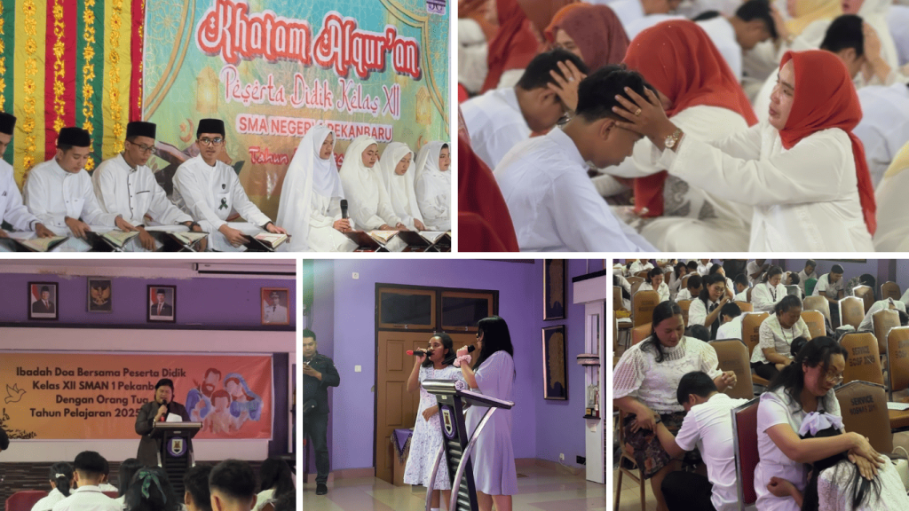 Acara ini turut dihadiri orang tua/wali siswa kelas XII SMAN 1 Pekanbaru pada Kamis (05/02/2026). Siswa kelas XII Muslim mengikuti acara Khatam Al-Qur’an yang diselenggarakan di lapangan basket sekolah, sementara siswa Kristen mengikuti Ibadah Doa Bersama di Aula Lantai tiga.
